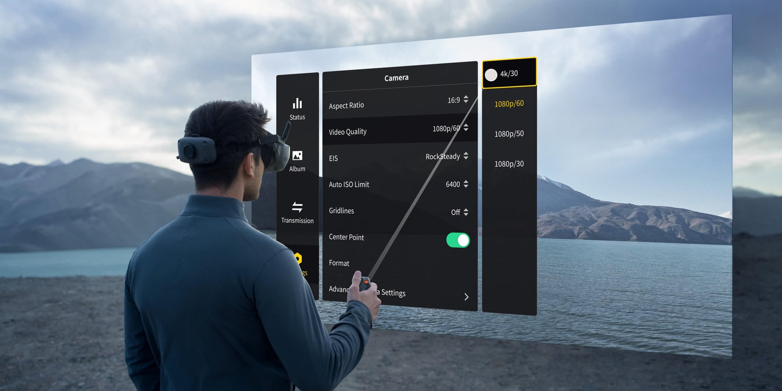 DJI RC Motion can be used as an AR cursor before the aircraft takes off, or when the aircraft is hovering after braking. This allows you to effortlessly activate functions and adjust settings without taking your hands off RC Motion 3.