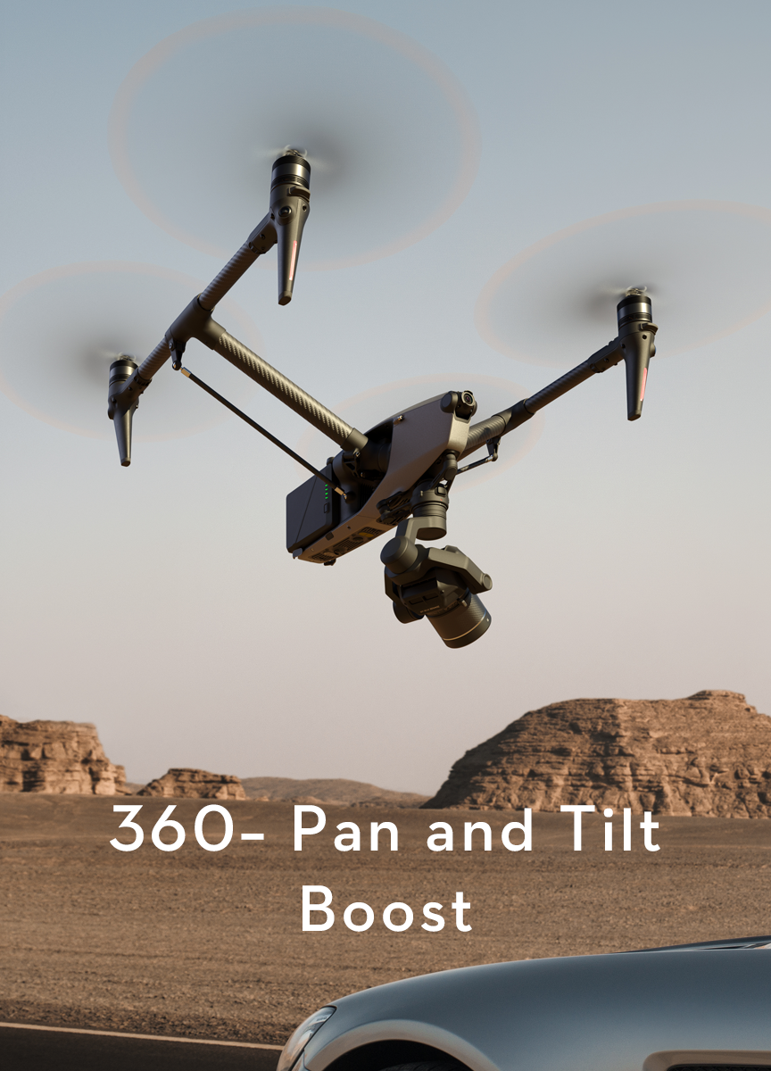 When the landing gear of DJI Inspire 3 is raised, it supports 360° pan shooting obstruction-free. When the landing gear is lowered and the gimbal camera faces forward, it can achieve 80° tilt shooting obstruction-free.