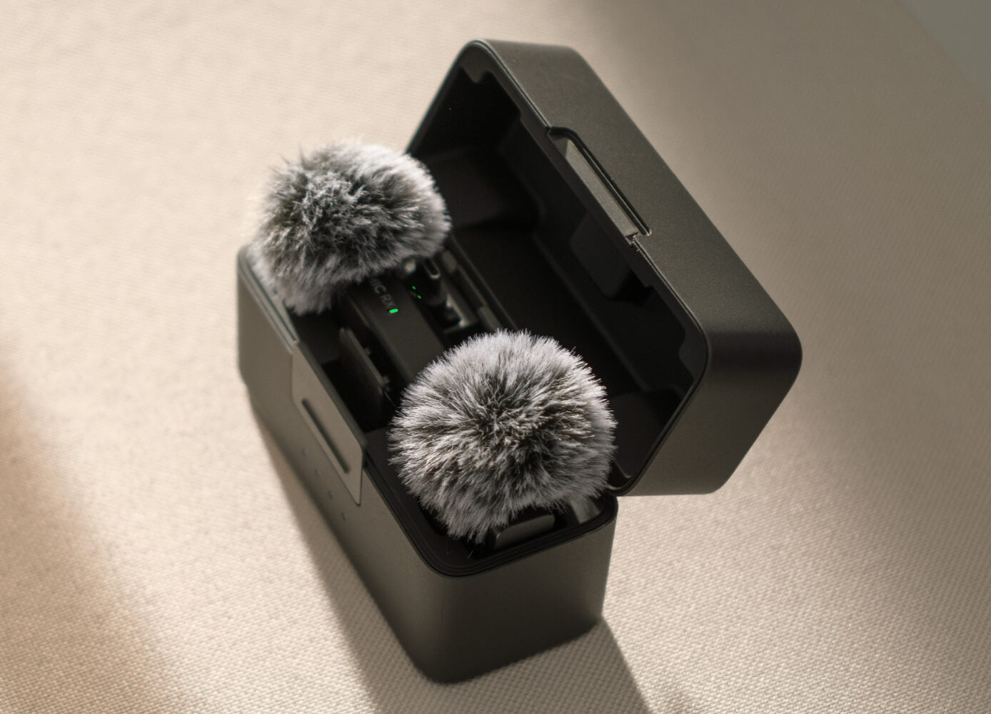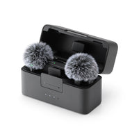 The compact DJI Mic Mini features an innovative design for easy storage. The charging case can neatly store two transmitters, one receiver, mobile phone adapters, and windscreens. The windscreens on the transmitters do not need to be removed when stored in the case. The entire set is convenient to use and easy to store.