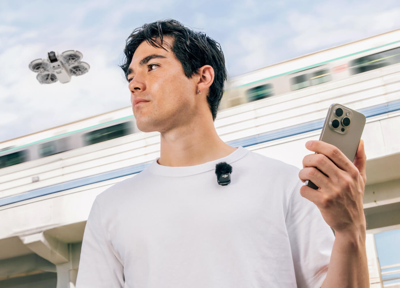 DJI Mic Mini is compatible with the DJI Neo drone. Once the drone is connected to the DJI Fly app, you can connect it to DJI Mic Mini via your smartphone's Bluetooth for audio recording. The DJI Fly app also automatically eliminates propeller noise and merges the audio track with the footage, ensuring clear sound even when shooting low-altitude vlogs. Produce high-quality content on the go, with excellent audio and visuals.