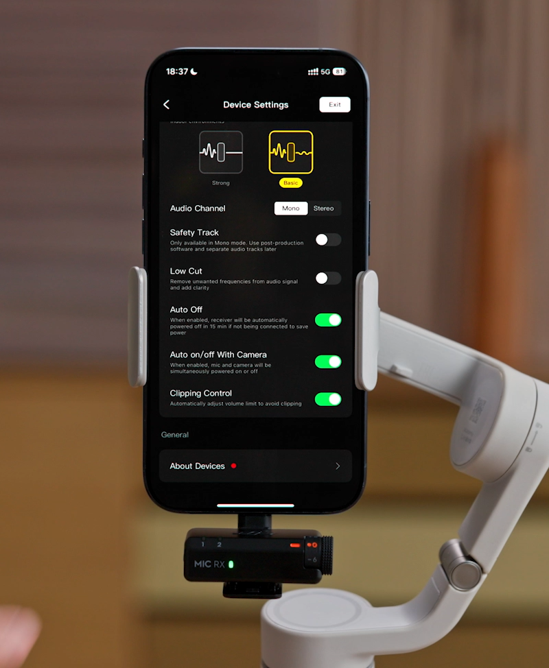 DJI Mic Mini offers two noise cancellation levels to suit different environments. The Basic level is perfect for quiet indoor settings, reducing fan, air conditioning, and reverb noises while preserving vocal clarity.