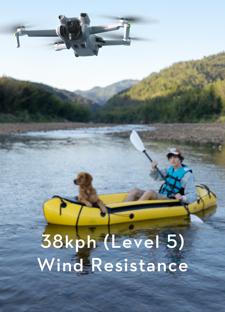 * Wind resistance is dependent upon propulsion. With strong winds, slight vibration is expected due to the lightweight nature of the drone. High-powered propulsion ensures the drone hovers stably or returns home safely. DJI Mini 3 automatically controls the gimbal to make slight adjustments to ensure that the footage is always stable and not affected by the wind.