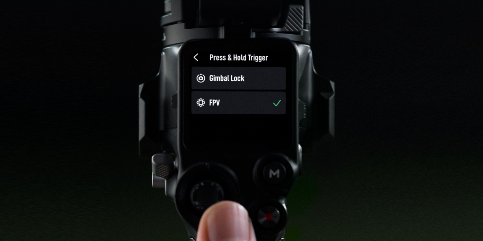 The trigger function can be customised to FPV mode, where pressing and holding the trigger makes the gimbal's three axes follow the direction of the grip's movement. This is particularly useful for shooting rotational footage or simulating POV.