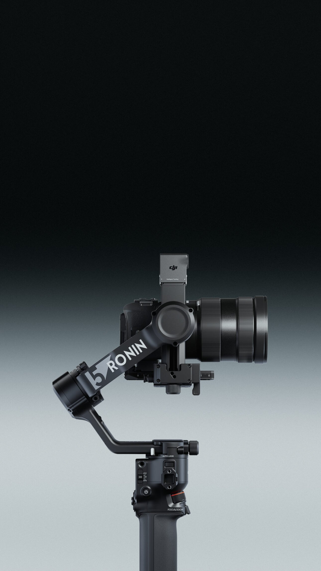 DJI RS 5 features touchscreen subject selection with the new tracking module, smooth balancing from fine-tuning knobs, and direct control via the new briefcase handle—all backed by faster charging and extended battery life.