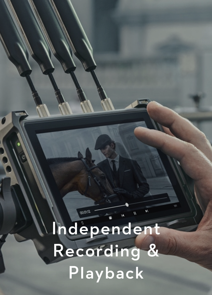 The High-Bright Remote Monitor features a microSD card slot and allows for independent recording and storage of up to 1080p/60fps H.264 live feeds. The remote monitor can automatically start and stop recording in synchronisation with the camera, making it easy to edit proxies right on set. When several remote monitors are used in conjunction, each monitor can even record or playback footage independently without interfering with other monitors.
