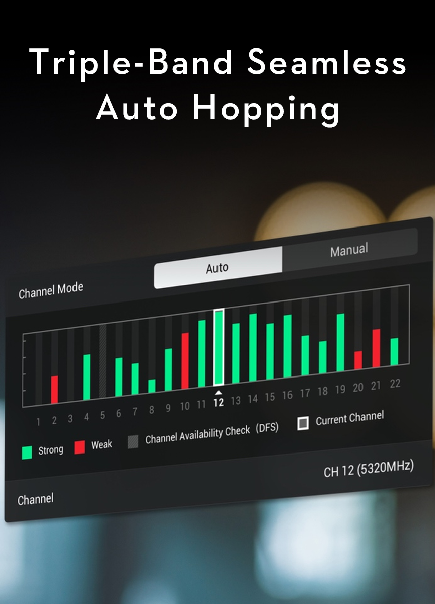 O3 Pro adds DFS bands* on top of the traditional 2.4 GHz and 5.8 GHz frequency bands, offering up to 23 channel options that provide professional crews with more compliant and interference-free transmission channels. In addition, DJI Transmission supports triple-band automatic frequency hopping, which automatically scans the electromagnetic environment for the best wireless channel.